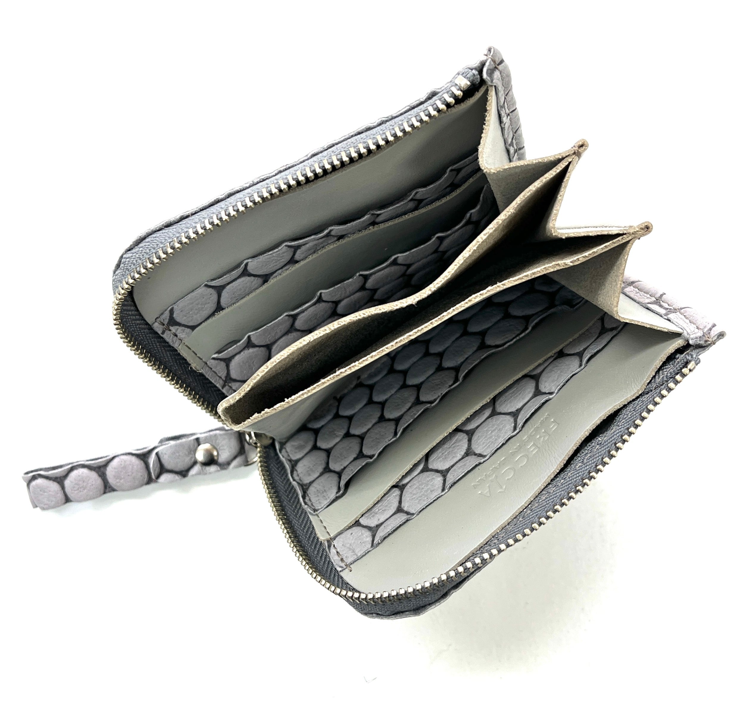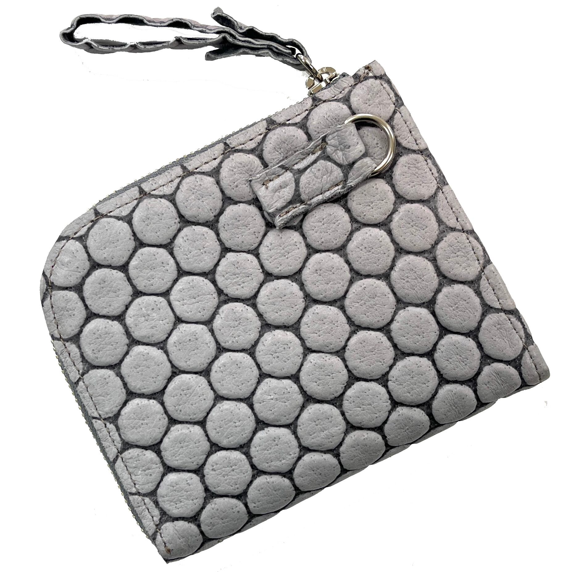 良質な牛革に凹凸のドットの型押しを施したミニラウンドウォレットです。