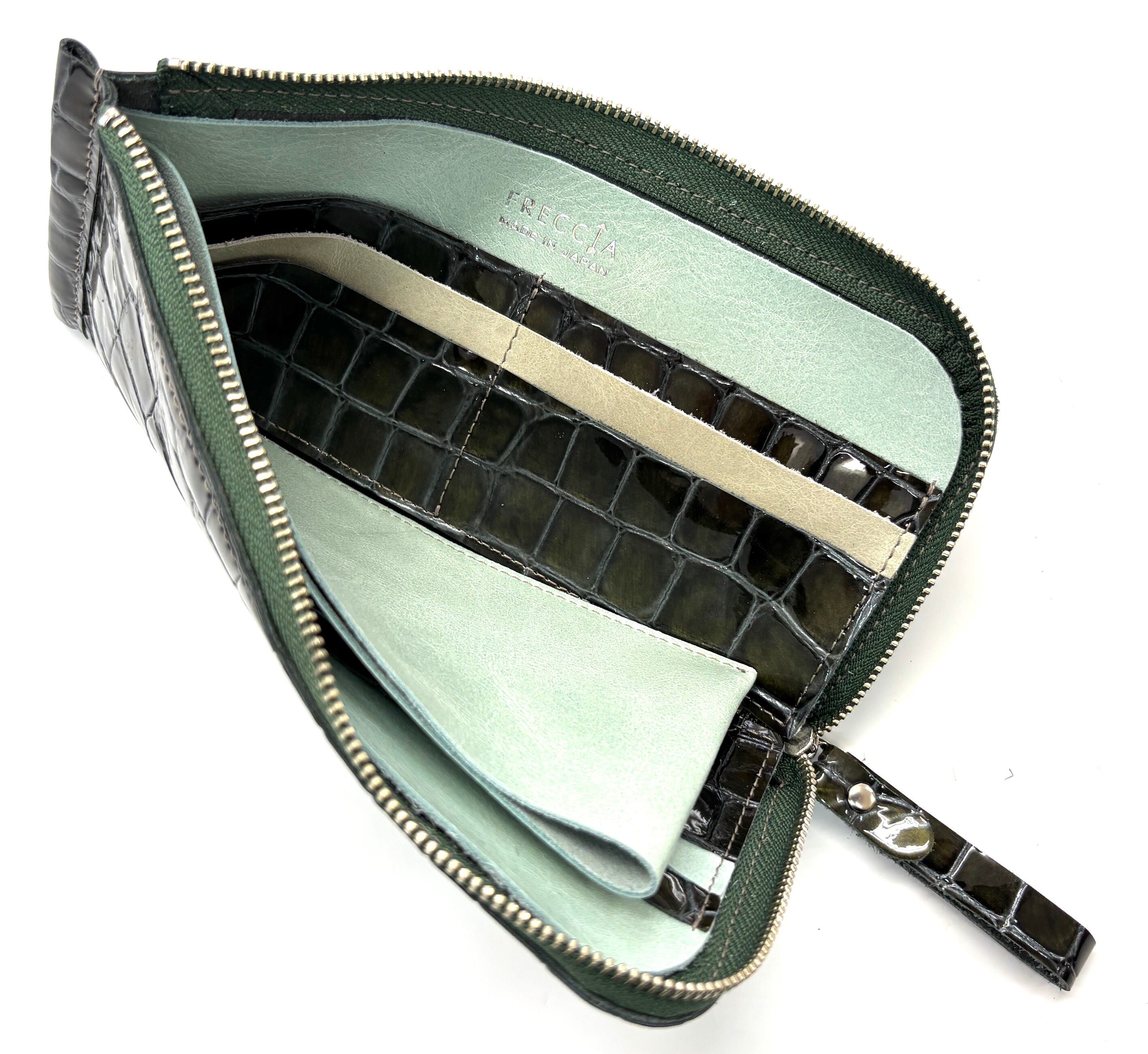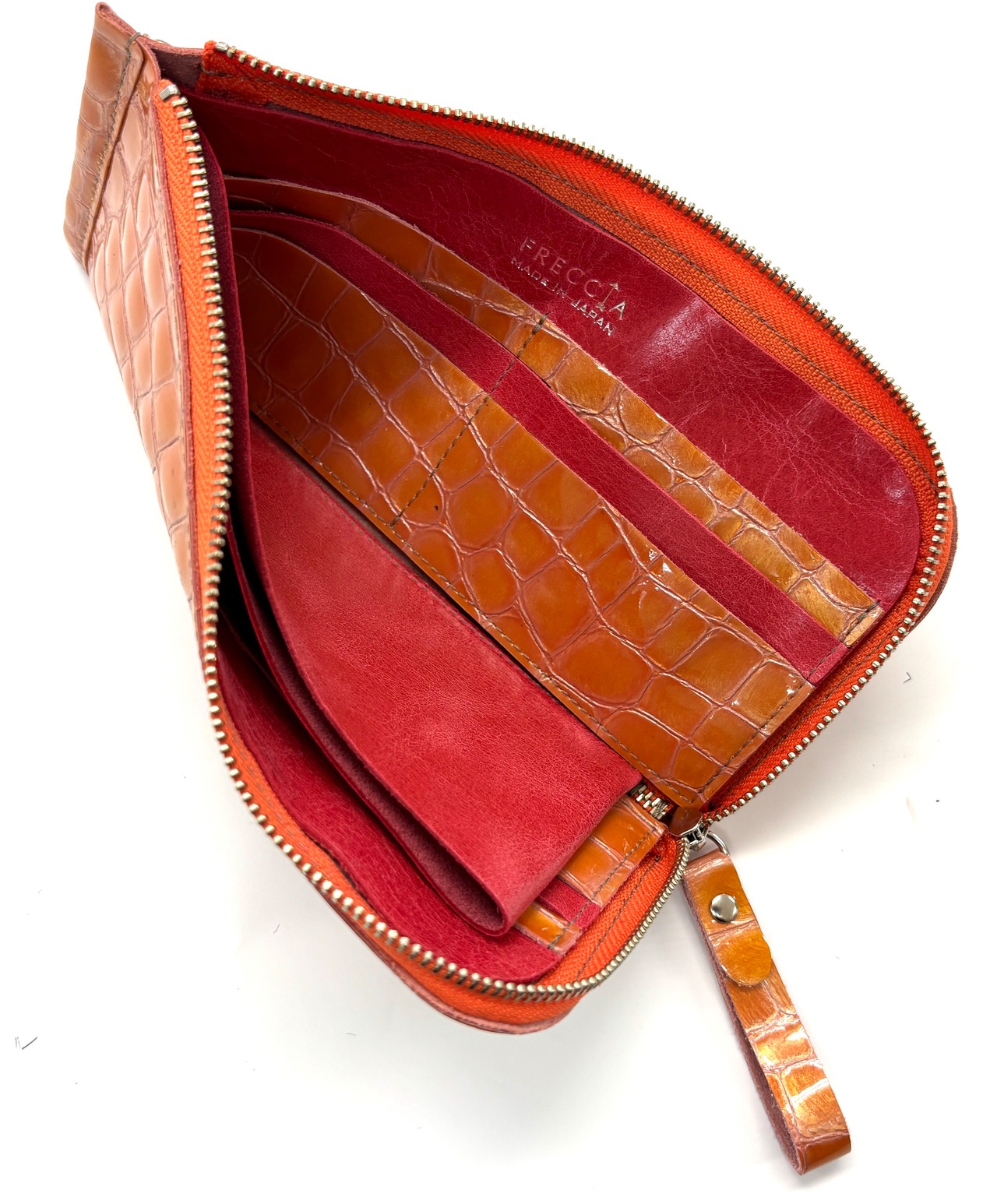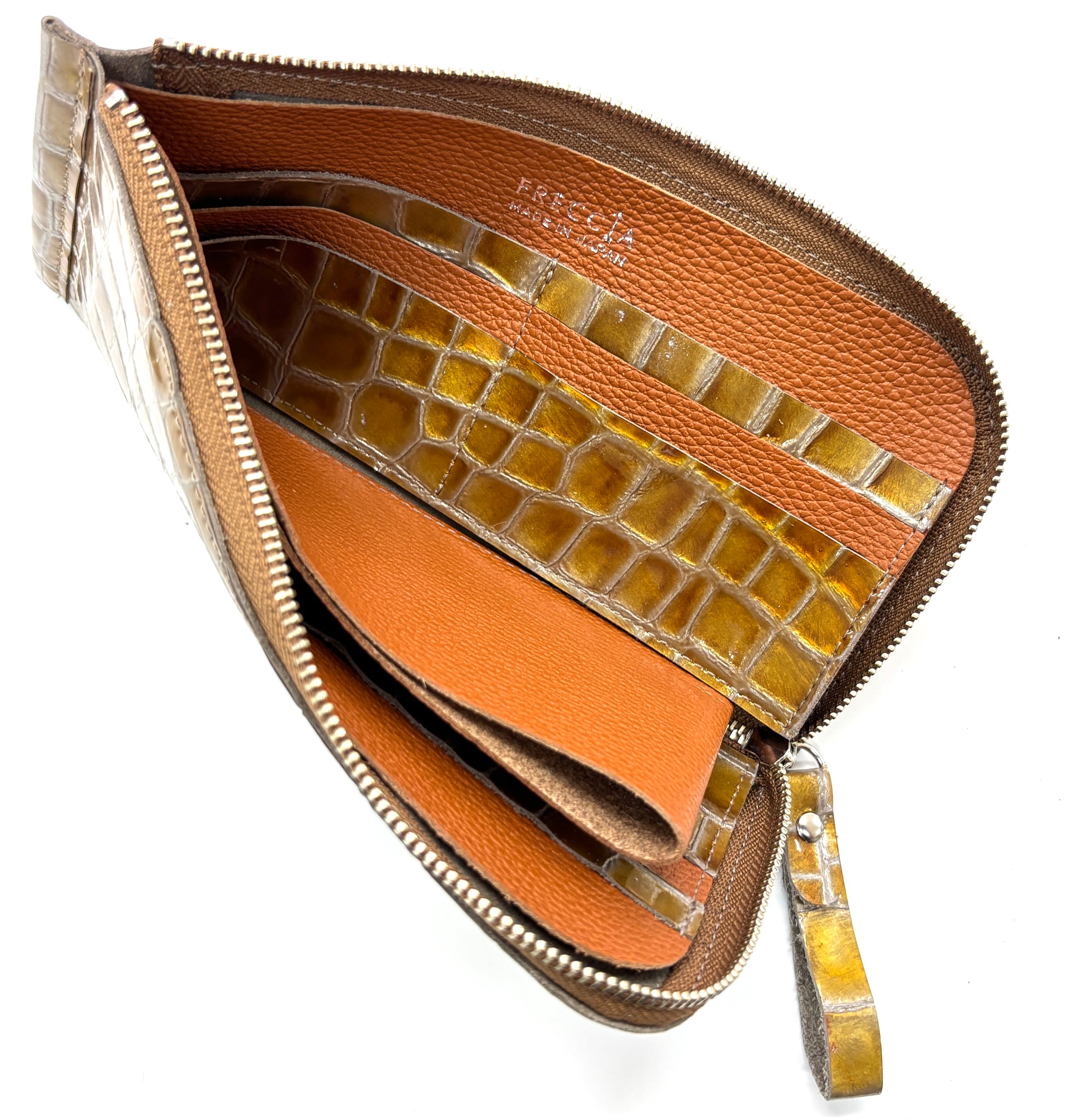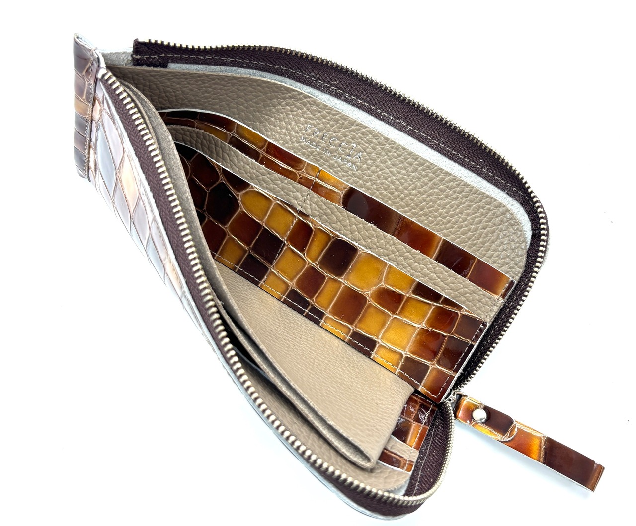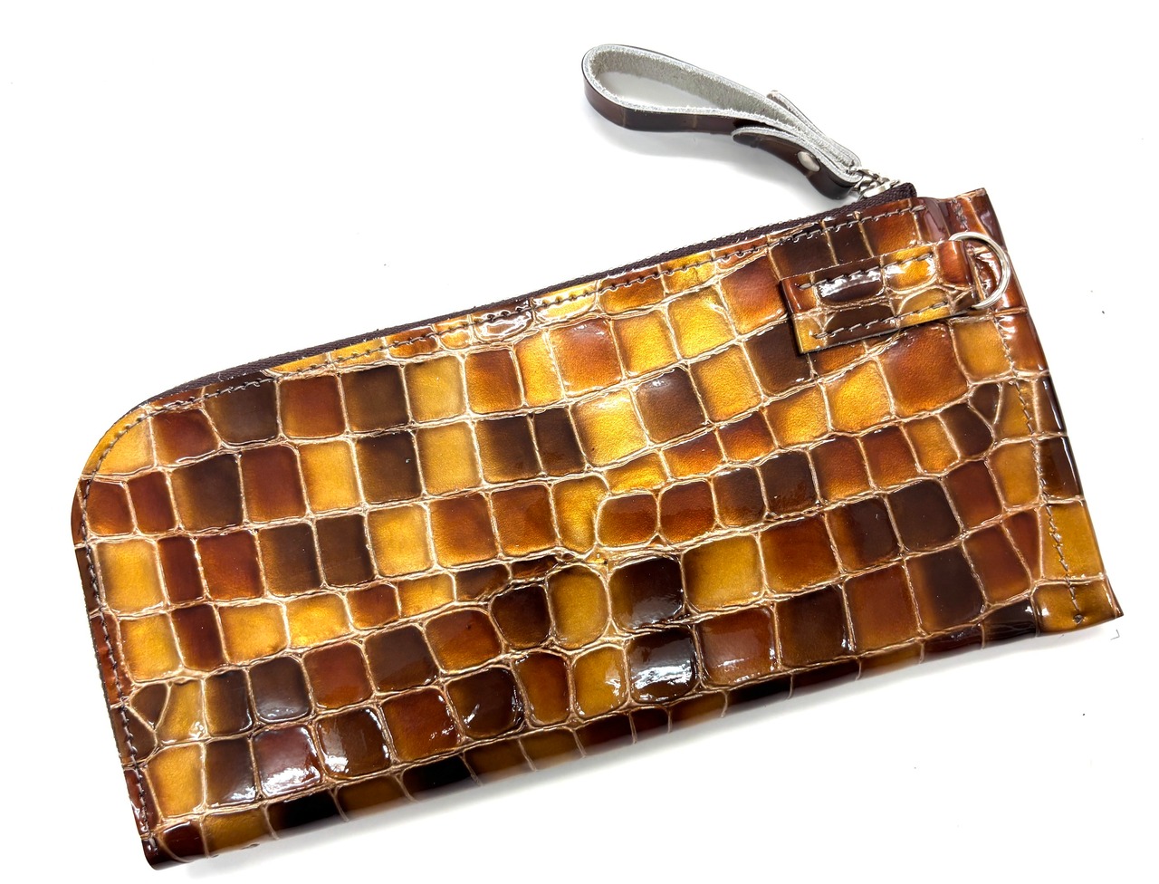良質な本革を使用したサスティナブルなロングウォレット イタリア製エナメル牛革 クロコダイル型押しシリーズです。イタリアならではの色使いとエナメルの光沢感がとても素敵です。シンプルでありながらも上品さを演出します。シックな色から明るいお色までお選びいただけ、普段使いから特別なシーンまで幅広く活躍するアイテムです