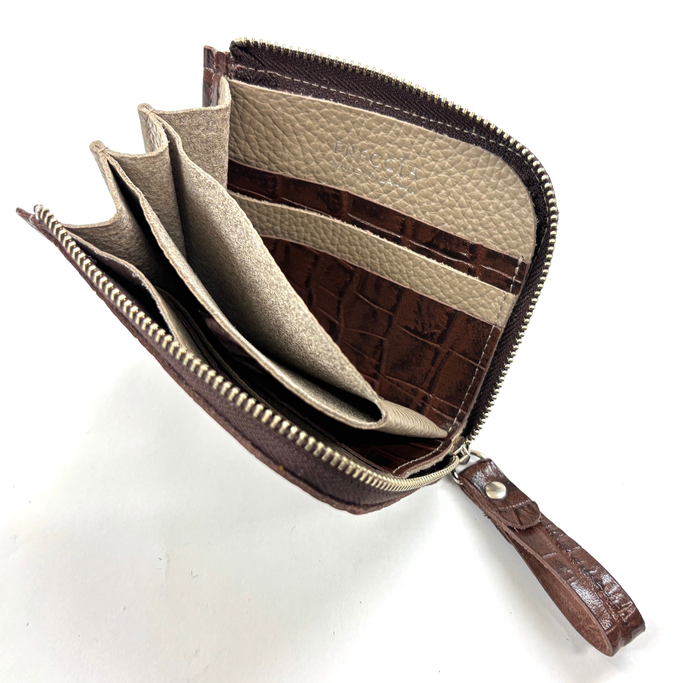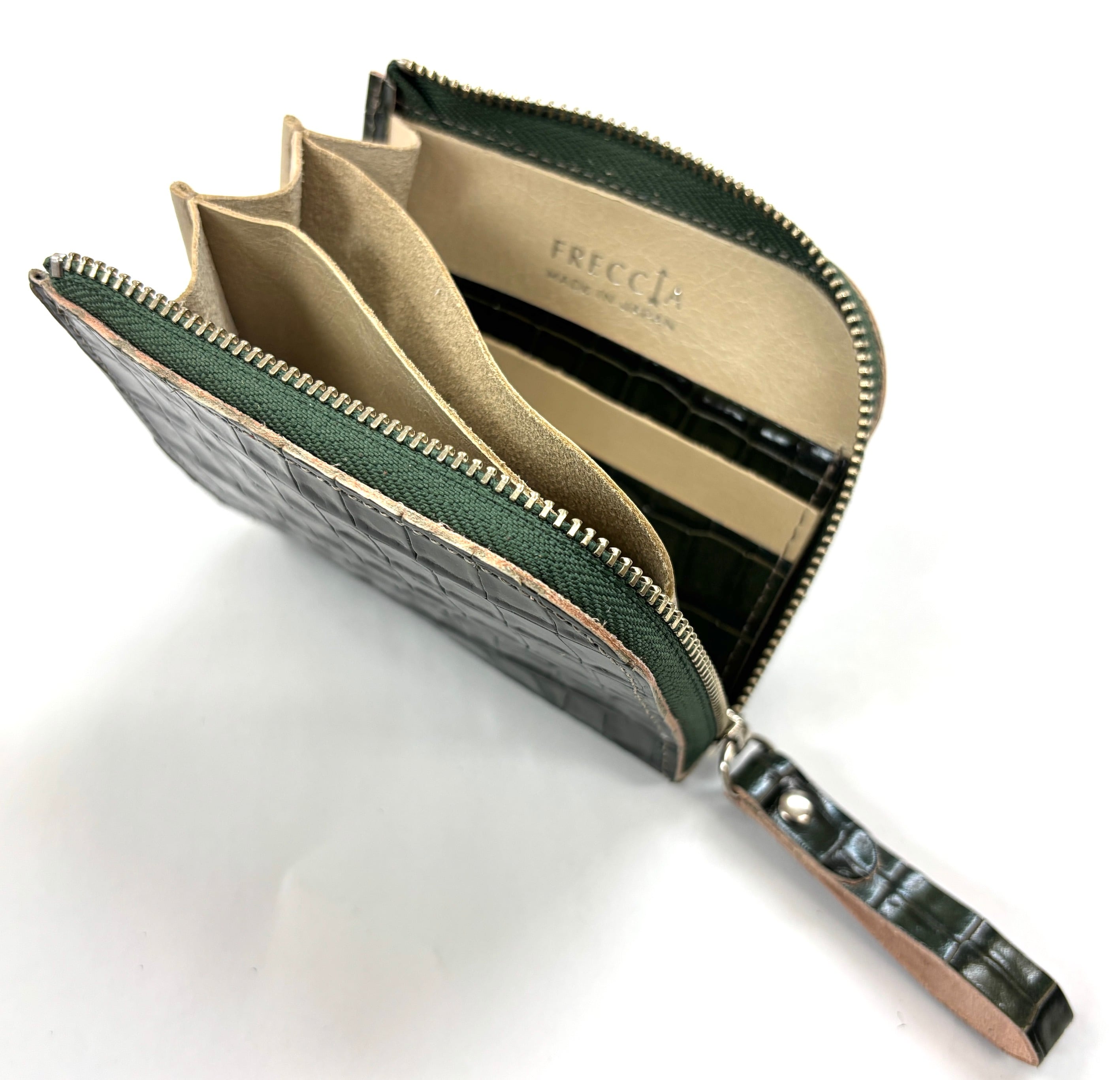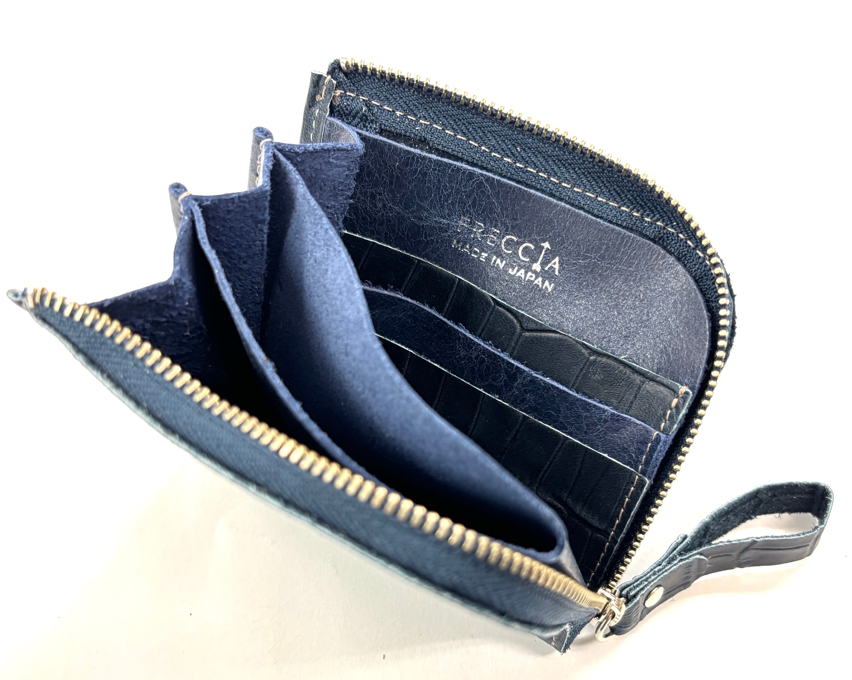 良質な牛革にクロコダイルの型押しが施されたミニラウンドウォレットです。