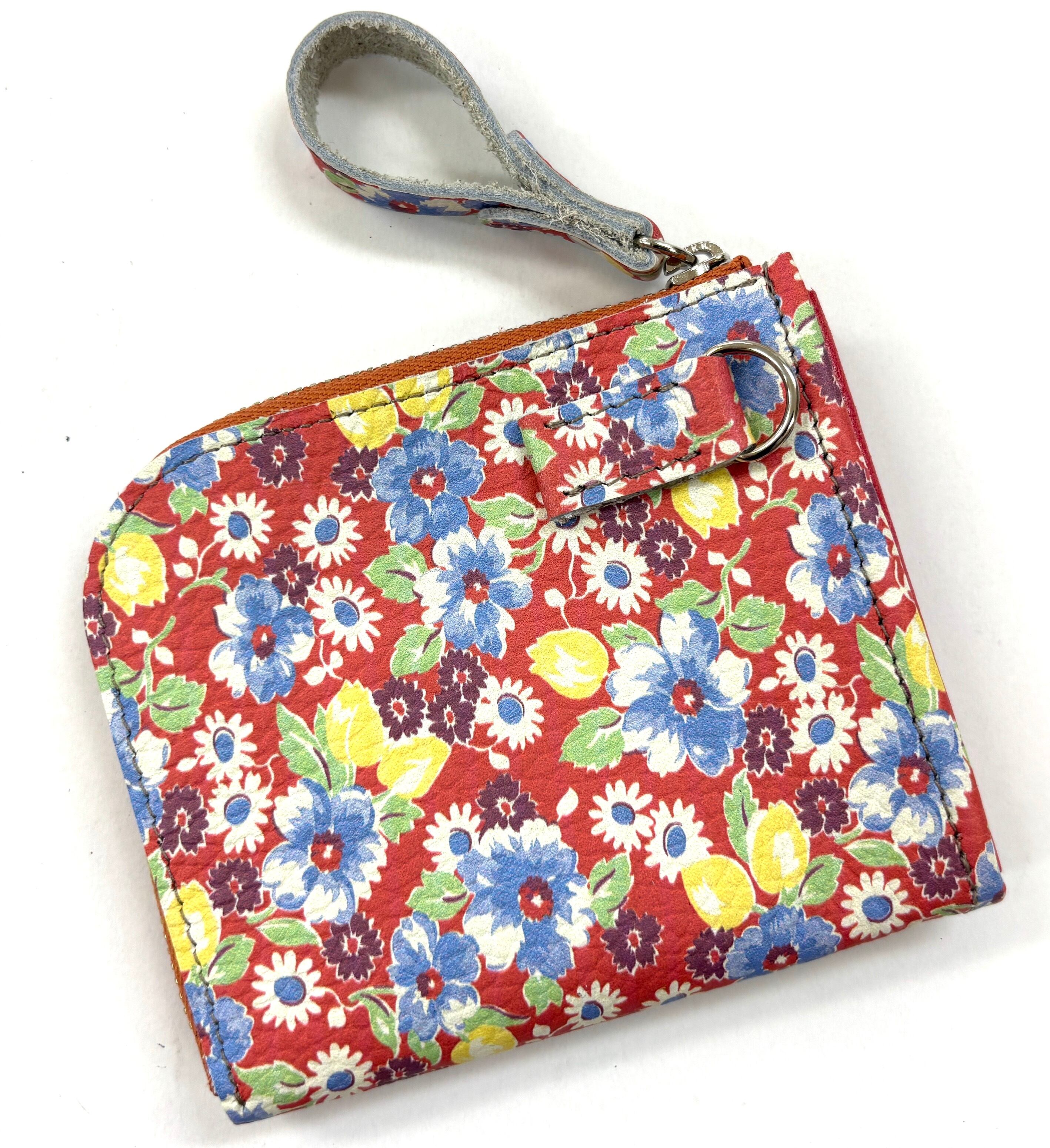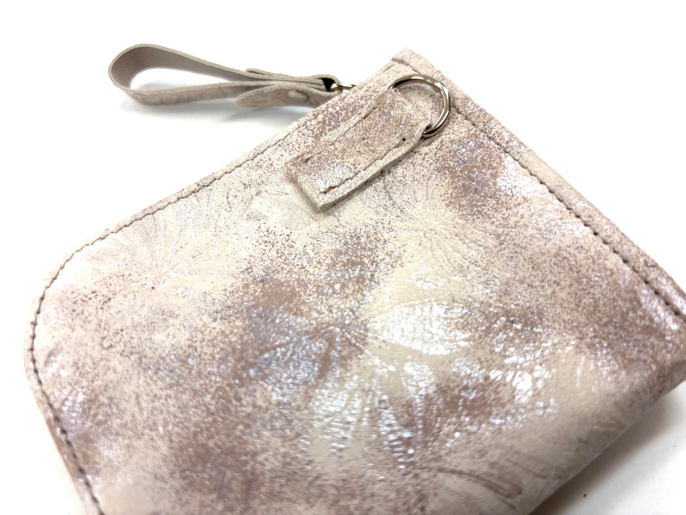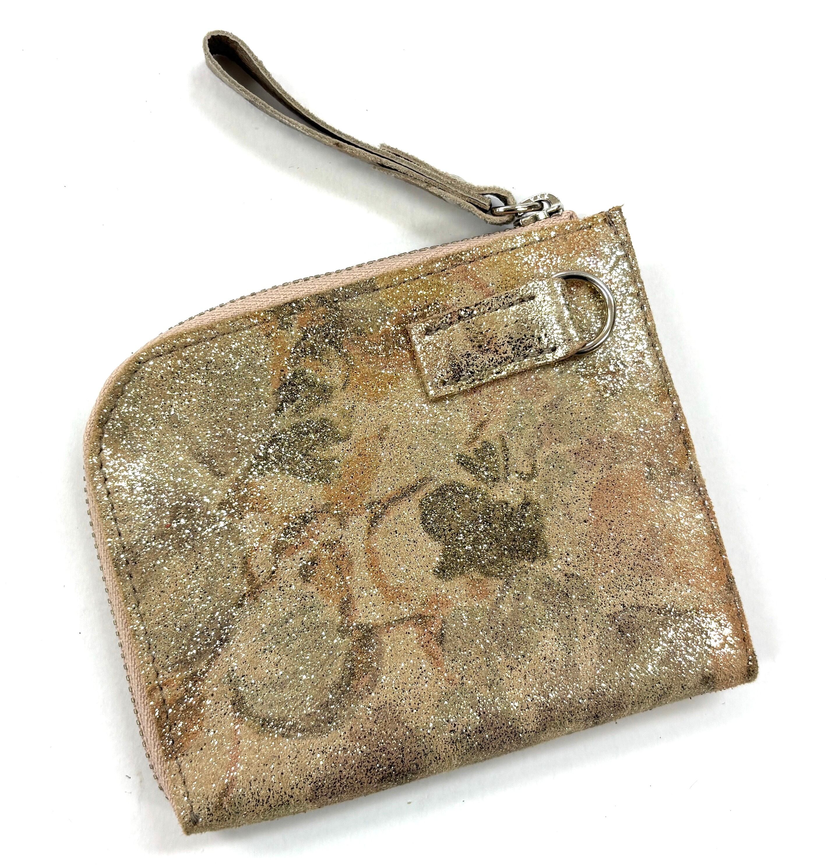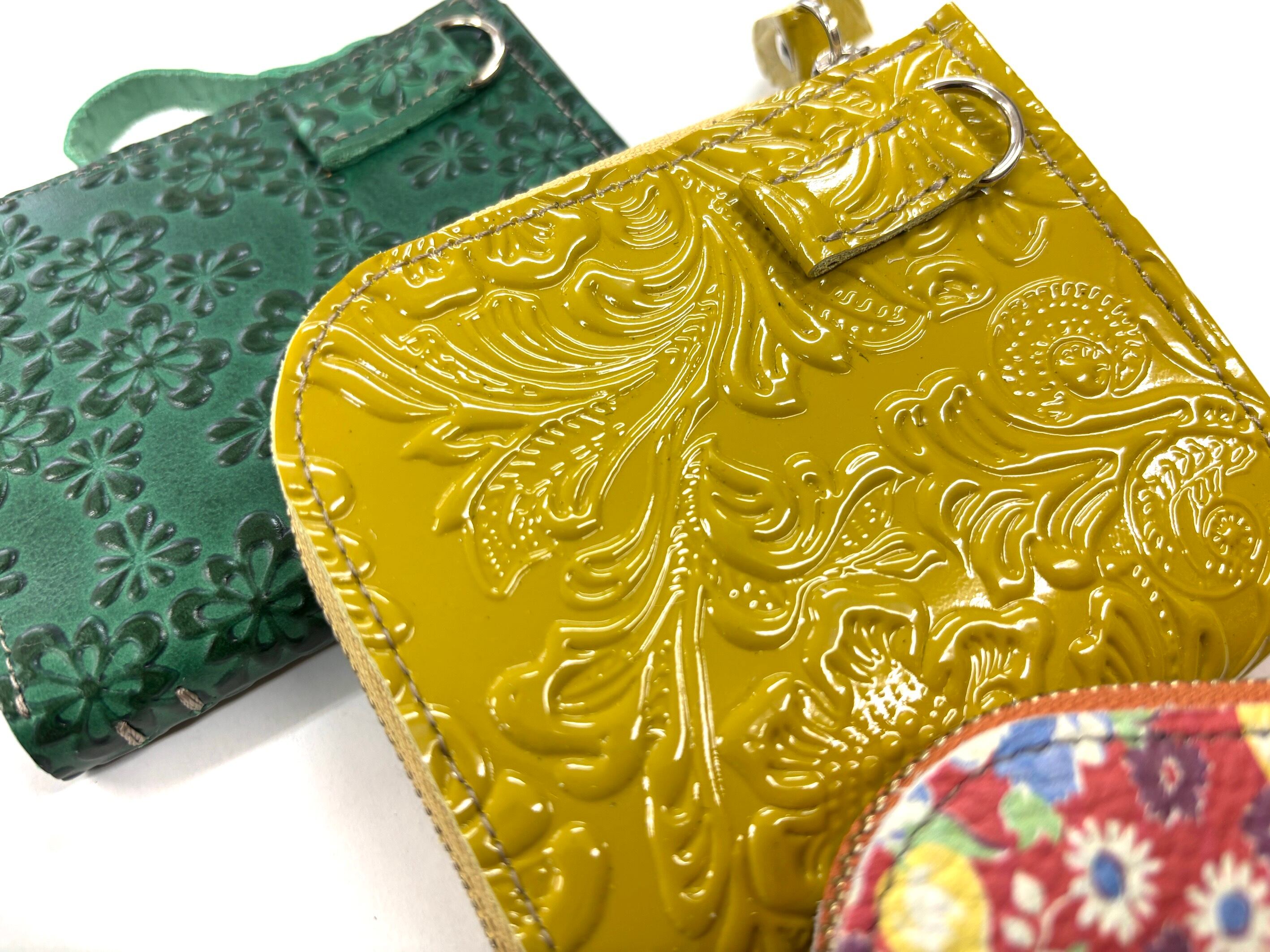 良質な牛革にラメプリント・カラープリント・型押し・エナメル加工 等が施されたミニラウンドウォレットです。どれもフラワー柄です。