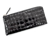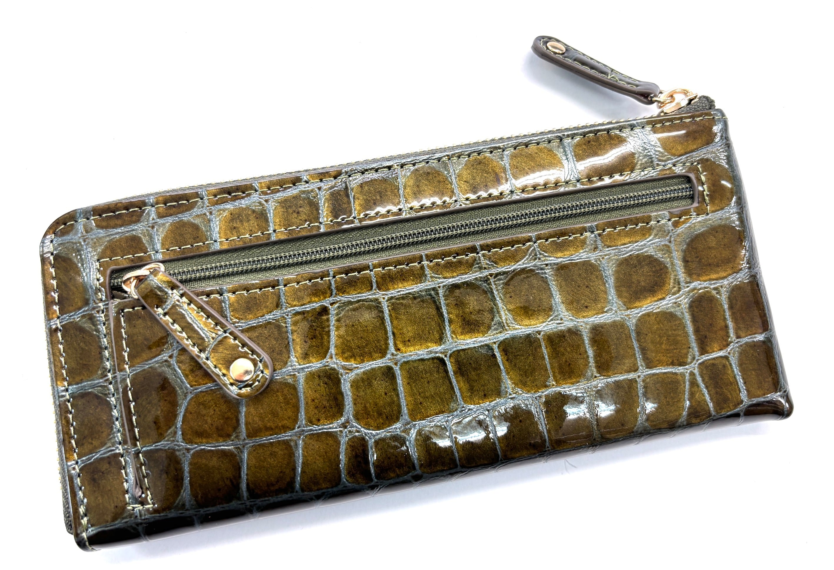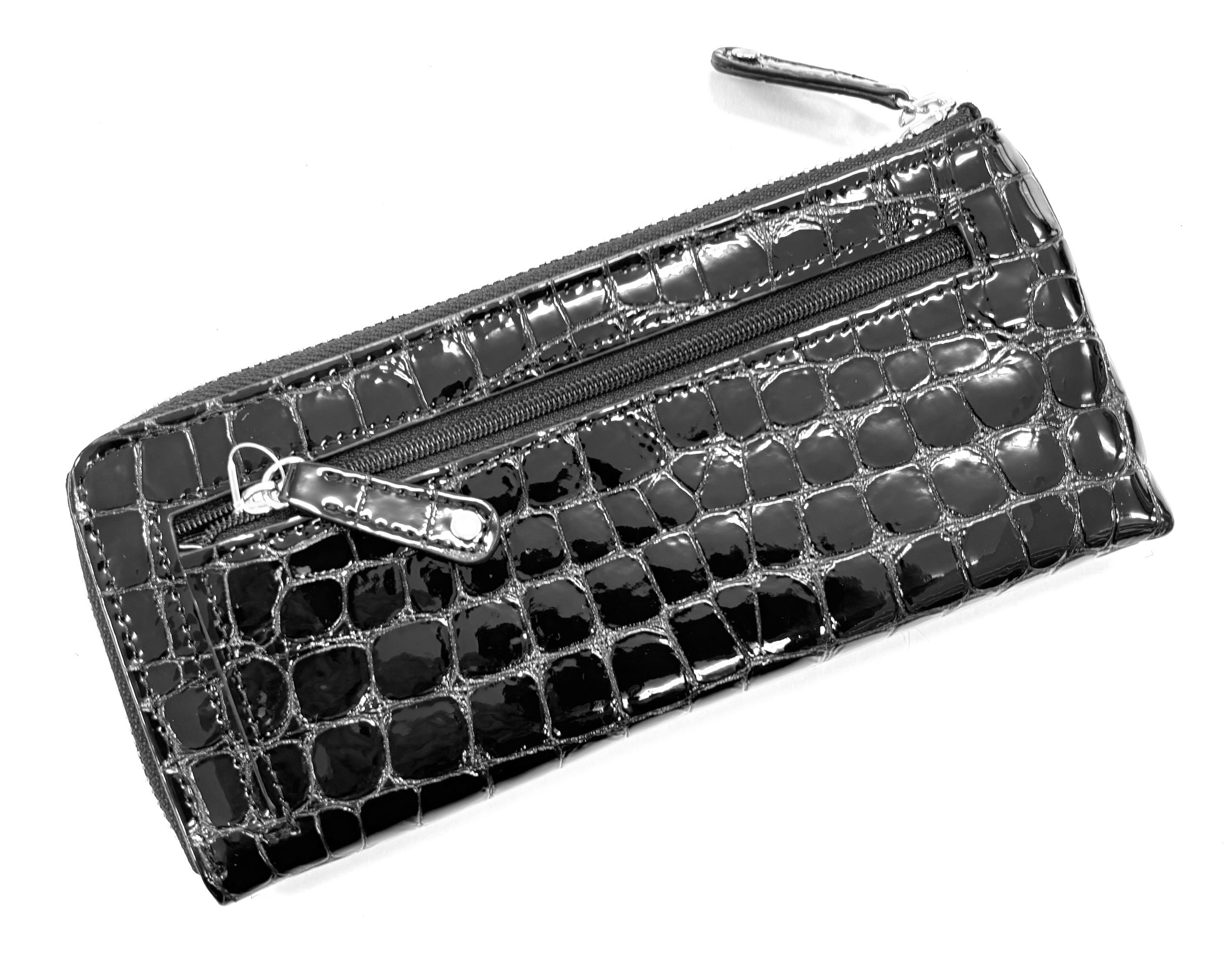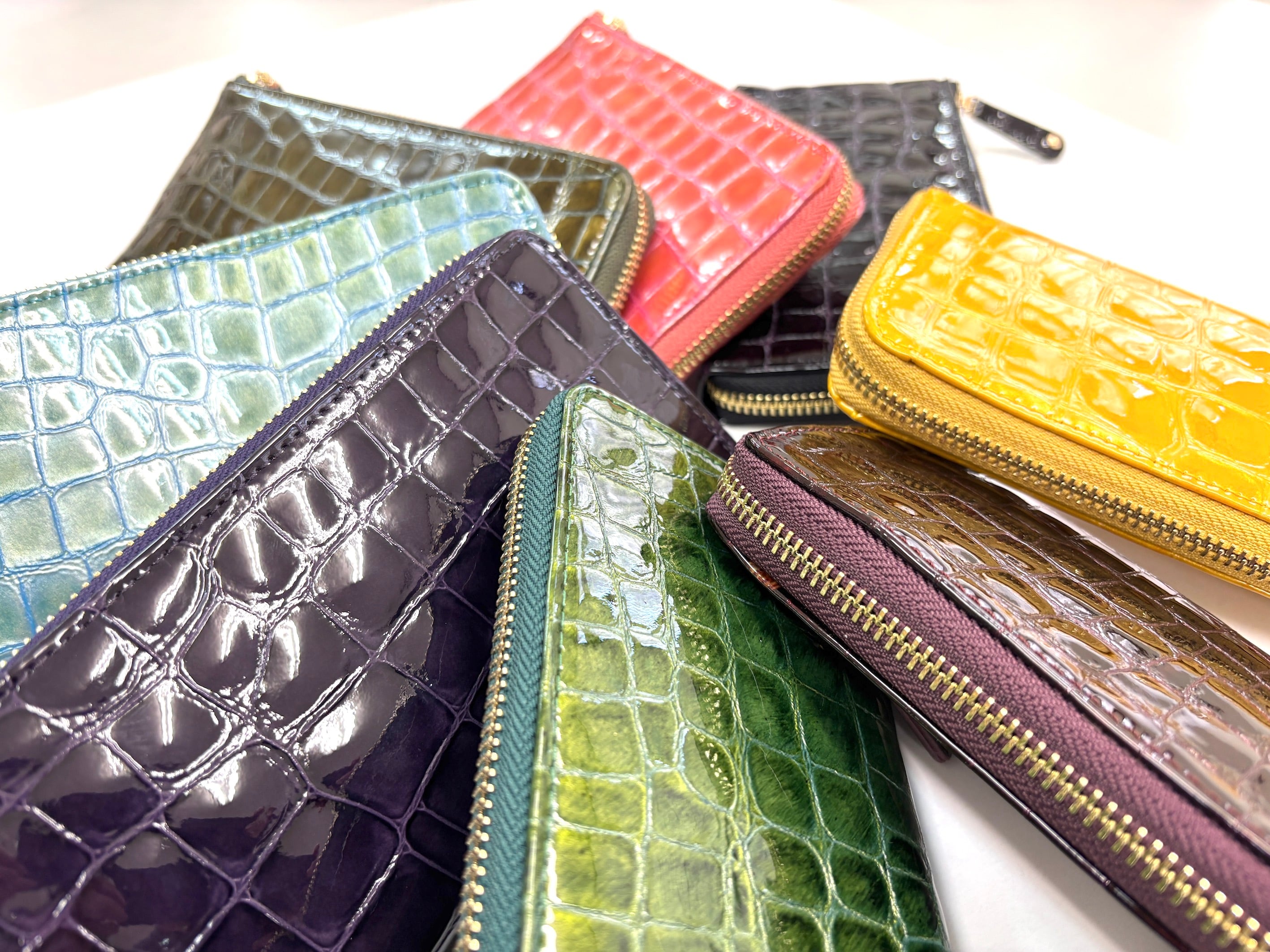良質な牛革にクロコダイル(ワニ)の型押しをし、そこに手作業で染色をし表面にエナメルコーティングを施したエナメルレザーを使用しております。